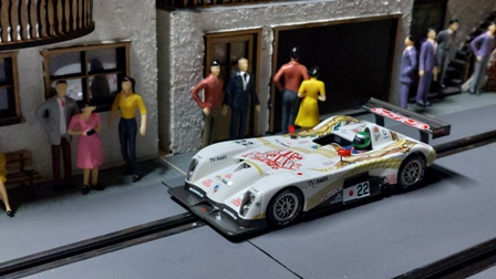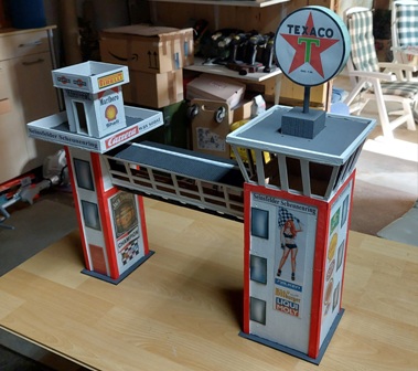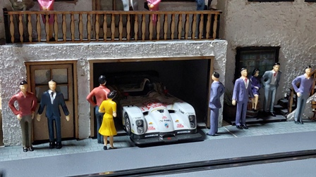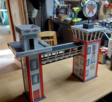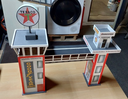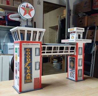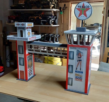 Bau einer Garage für die Boxengasse 09 Als Material habe ich 3mm Hartschaumplatten und Balsaholz verwendet. Die Werbung und auch die Inneneinrichtung habe ich am PC entworfen, ausgedruckt und aufgeklebt. Als Beleuchtung habe ich eine kleine Lichterkette mit Batterien verwendet.